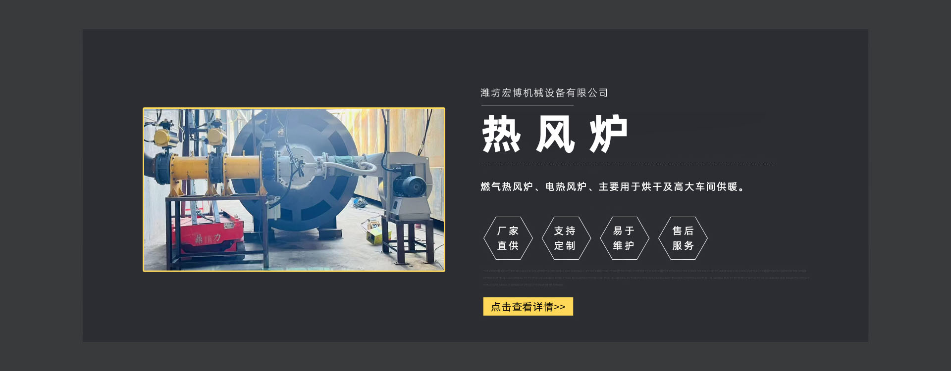 濰坊宏博機(jī)械設(shè)備有限公司是從事熱風(fēng)爐、烘干設(shè)備、供暖設(shè)備的研發(fā)(fā)、設(shè)計(jì)、制造和服務(wù)于一體的實(shí)體企業(yè)(yè)。長(zhǎng)期以來,企業(yè)(yè)以市場(chǎng)的發(fā)(fā)展和客戶的需求為導(dǎo)向,集多年的生產(chǎn)(chǎn)技術(shù)(shù)與經(jīng)(jīng)驗(yàn)為一體,不斷開發(fā)(fā)和優(yōu)(yōu)良產(chǎn)(chǎn)品。